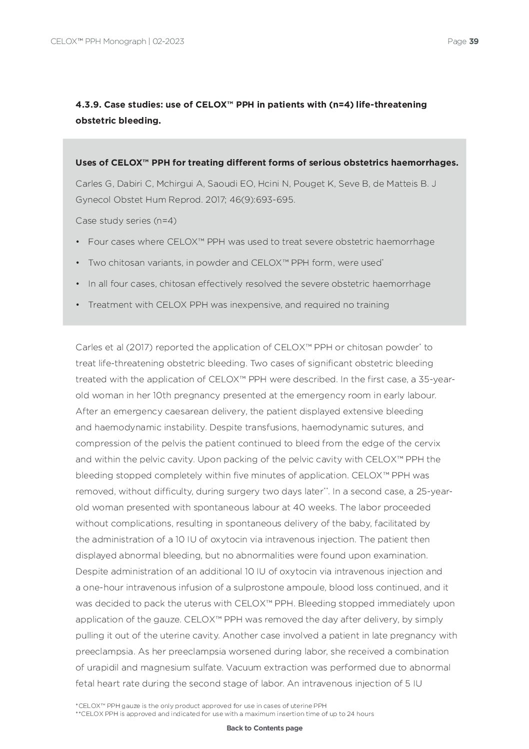 Uses of CELOX™ PPH for treating different forms of serious obstetrics haemorrhages.