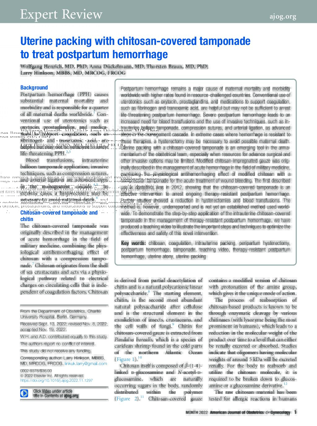 Postpartum hemorrhage (PPH) causes substantial maternal mortality and morbidity and is responsible for a quarter of all maternal deaths worldwide.1 Conventional use of uterotonics such as oxytocin, prostaglandins, and medications to support coagulation, such as fibrinogen and tranexamic acid, are helpful but may not be sufficient to arrest life-threatening PPH. Blood transfusions, intrauterine balloon tamponade application, invasive techniques, such as compression sutures, and arterial ligation are advanced steps in the management cascade. In extreme cases, a hysterectomy may be necessary to avoid maternal death.